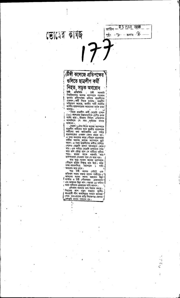 টঙ্গী কলেজে প্রতিপক্ষের গুলিতে ছাত্রলগি কর্মী নিহত সড়ক অবরোধ Published on Newspaper দৈনিক ভোরের কাগজ Category Student Politics Download
