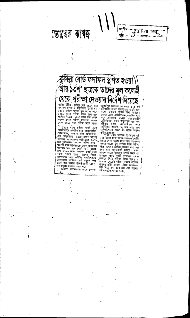 কুমিল্লা বোর্ড ফলাফল স্থগিত হওয়া প্রায় ১৩শ ছাত্রকে তাদের মূল কলেজ থেকে পরক্ষা দেওয়ার নির্দেশ দিয়েছে Published on Newspaper দৈনিক ভোরের কাগজ Category Public Examination Public Examination Others Download