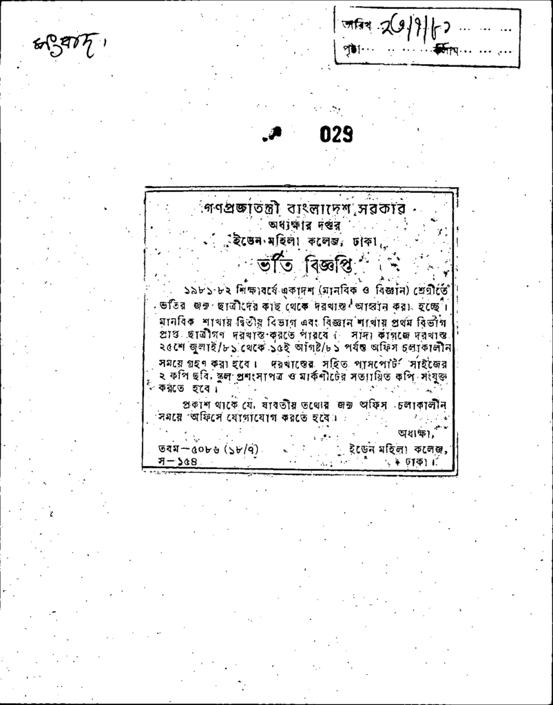 গণপ্রাজাতন্ত্রী বাংলাদেশ সরকার অধ্যক্ষার দপ্তর ইডেন মহিলা কলেজ ঢাকা ভর্তি বিঞ্জপ্তি Published on Newspaper দৈনিক সংবাদ Category General Education Download
