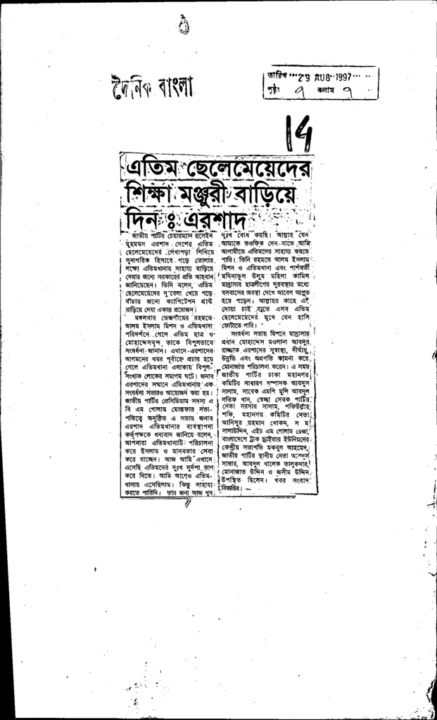 এতিম ছেলেমেয়েদের শিক্ষা মঞ্জুরী বাড়িয়ে দিন:এরশাদ