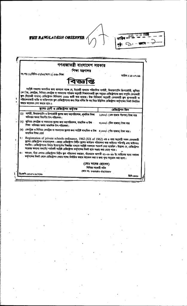 গনপ্রজাতন্ত্রী বাংলাদেশ সরকার শিক্ষা মন্ত্রণালয় বিজ্ঞপ্তি Published on Newspaper The Bangladesh Observer Category Others Download