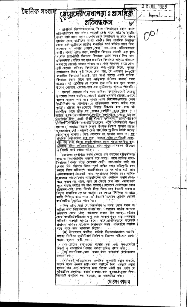 মেয়েদের লেকাপড়াঃ প্রসঙ্গিক প্রতিবন্ধকতা