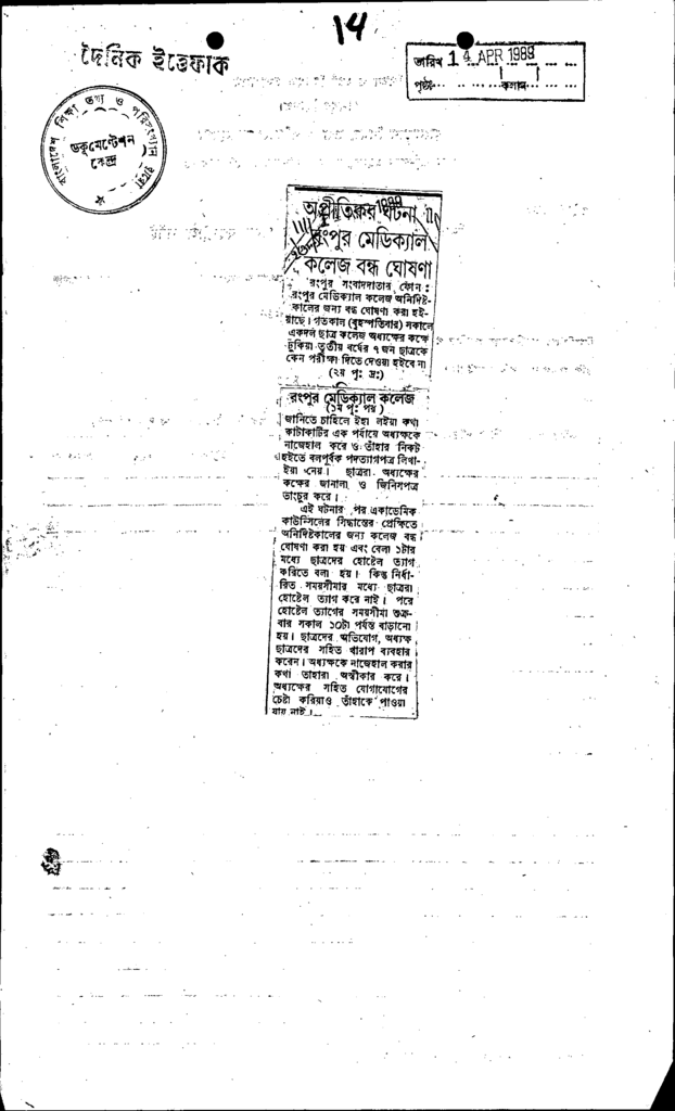 অপ্রীতিকর ঘটনা রংপুর মেডিক্যাল কলেজ বন্ধ ঘোষণা Published on Newspaper দৈনিক ইত্তেফাক Category Madrasah Education Madrasah Education Alia Download