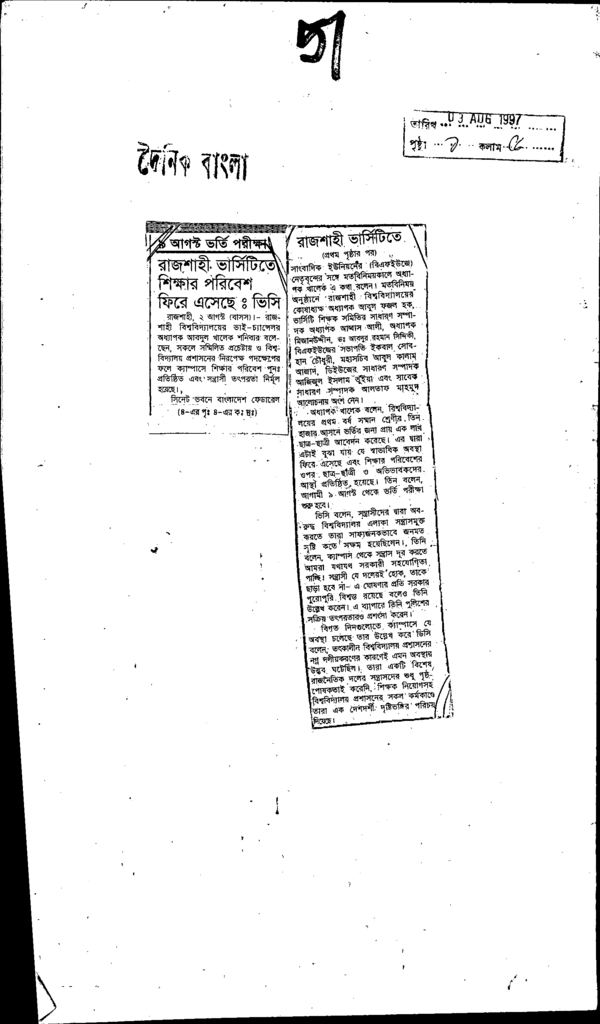 ৯ আগস্ট ভর্তি পরীক্ষা রাজশাহী বার্সিটিতে শিক্ষার পরিবেশ পিরে এসেছেঃ ভিসি Published on Newspaper দৈনিক বাংলা Category Admission / Seat Problem Admission/Seat Problem Download