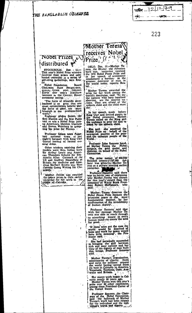 Mother teresa receives nobel prize Published on Newspaper The Bangladesh Observer Category General Education Download