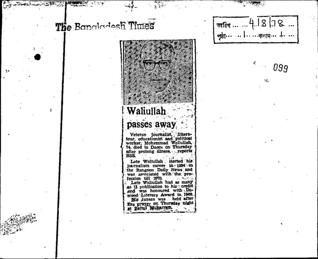 Waliullah passes away Published on Newspaper The Bangladesh Times Category General Education Download