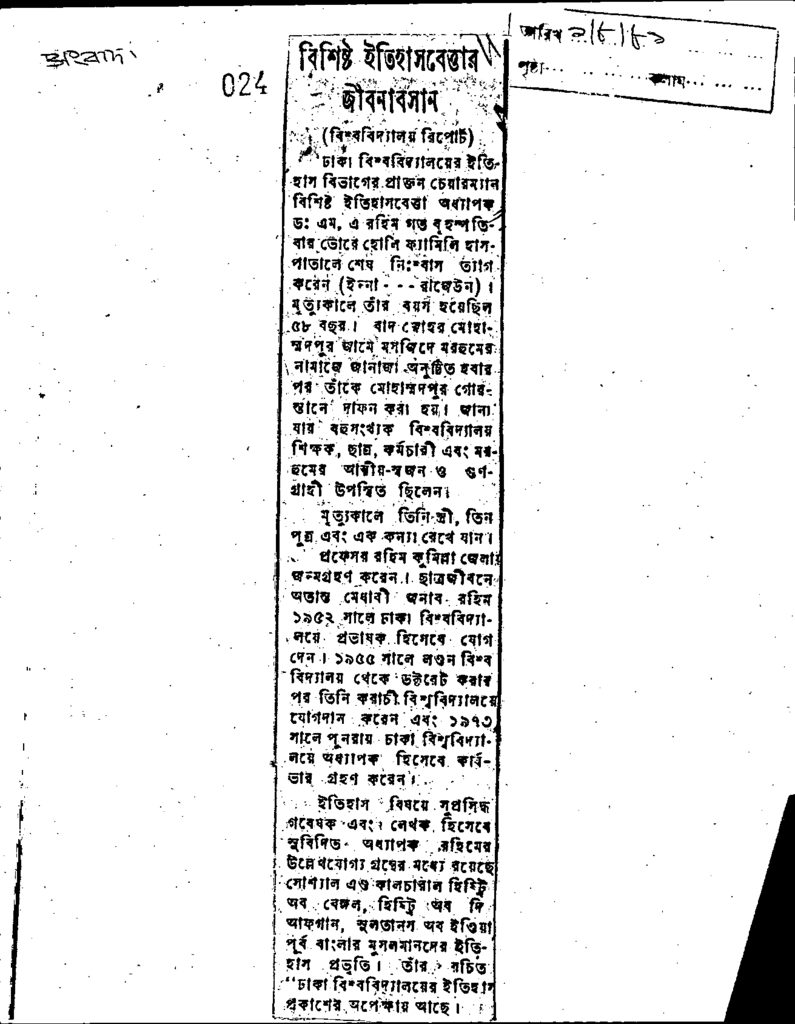 বিশিষ্ঠ ইতহাসবেত্তার জীবনাবসান