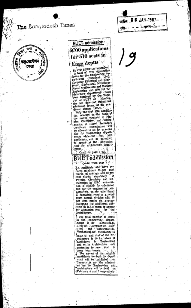 Buet admission 5700 apploications for 510seats in engg depts Published on Newspaper The Bangladesh Times Category Admission / Seat Problem Admission/Seat Problem Download