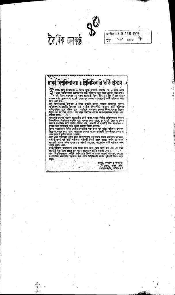ঢাকা বিশ্ববিদ্যালয়ঃ প্রিলিমিনারি ভর্তি প্রসঙ্গে Published on Newspaper দৈনিক জনকণ্ঠ Category Admission / Seat Problem Admission/Seat Problem Download