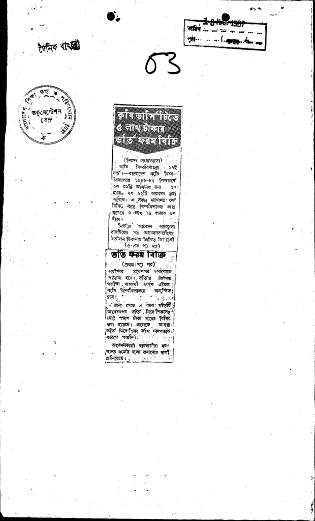 কৃষি ভার্সিটিতে ৫ লাখ টাকার ভর্তি ফরম বিক্রি