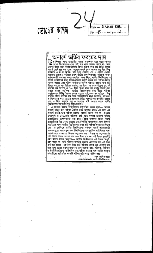অনার্সে ভর্তির ফরমের দাম Published on Newspaper দৈনিক ভোরের কাগজ Category Admission / Seat Problem Admission/Seat Problem Download