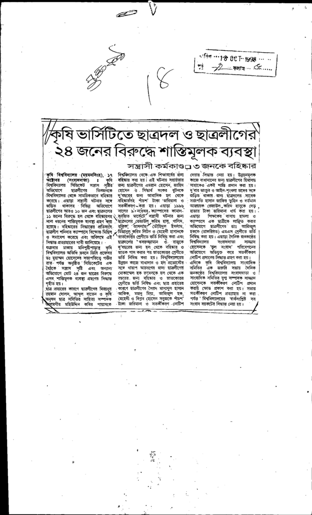 কৃষি ভার্সিটিতে ছাত্রদল ও ছাত্রলীগের ২৪জনের বিরুদ্ধে শাস্তিমূলক ব্যবস্থা