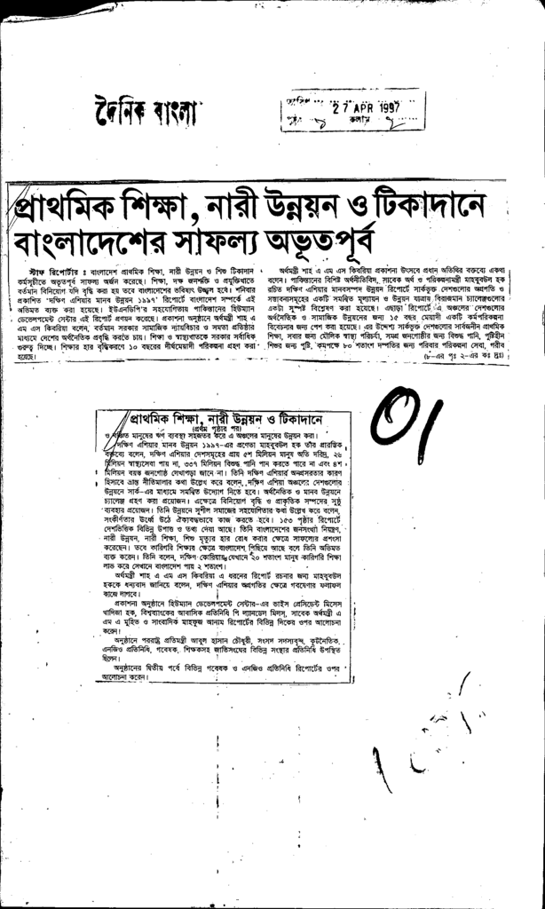 প্রাথমিক শিক্ষা নারী উন্নয়ন ও টিকাদানে বাংলাদেশের সাফল্য অভূতপূর্ব Published on Newspaper দৈনিক বাংলা Category Women Education Download
