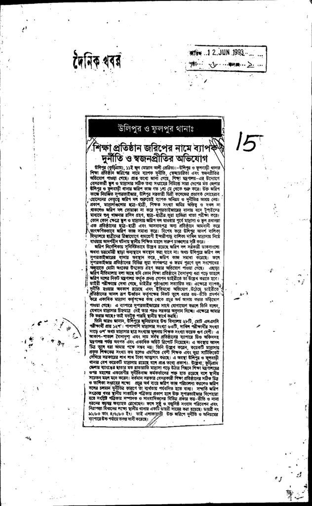 শিক্ষা প্রতিষ্ঠান জরিপের নামে ব্যাপক দুর্নীতি ও স্বজনপ্রীতির অভিযোগ Published on Newspaper দৈনিক খবর Category Educational Survey Download