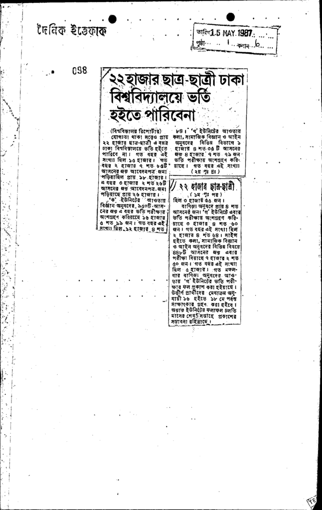 22 জাহার ছাত্র-ছাত্রী ঢাকা বিশ্ববিদ্যালয়ে ভর্তি হইতে পারিবেনা Published on Newspaper দৈনিক ইত্তেফাক Category General Education General Education Higher Education Public Download