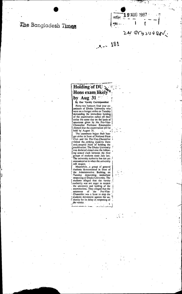 Holding of du hons exam likely by aug 31 Published on Newspaper The Bangladesh Times Category General Education General Education Higher Education Public Download