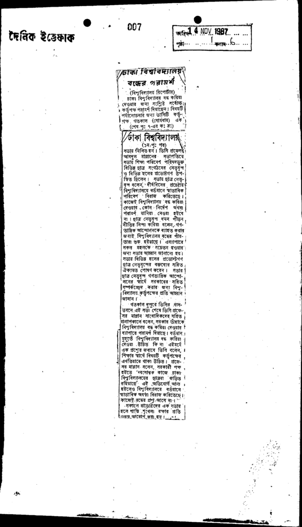 ঢাকা বিশ্ববিদ্যালয় বন্ধের পরামর্শ Published on Newspaper দৈনিক ইত্তেফাক Category General Education General Education Higher Education Public Download