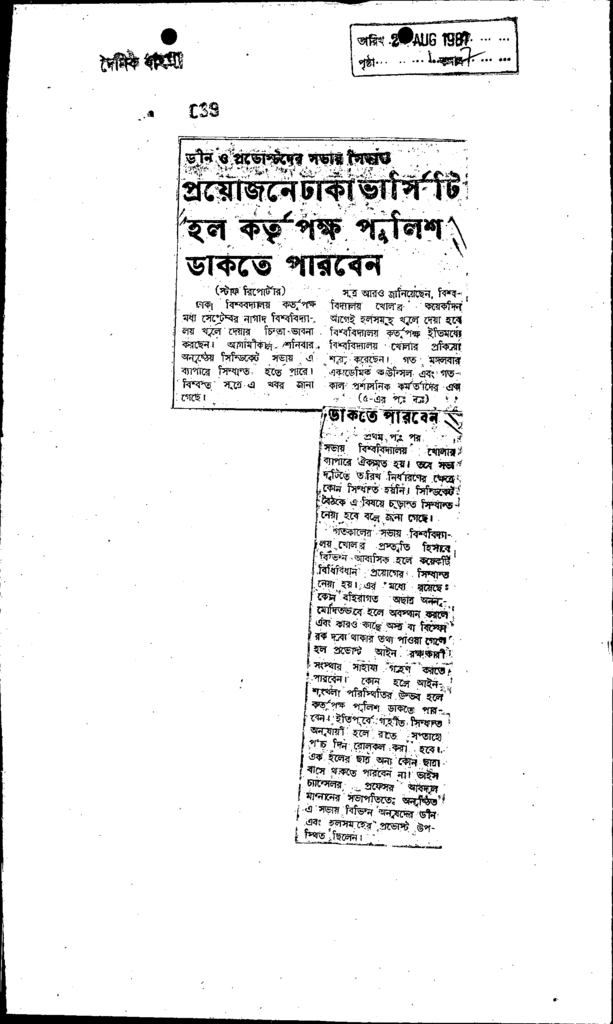 প্রয়োজনে ঢাকা ভার্সিটি হল কর্তৃপক্ষ পুলিশ ডাকতে পারে Published on Newspaper দৈনিক বাংলা Category General Education General Education Higher Education Public Download