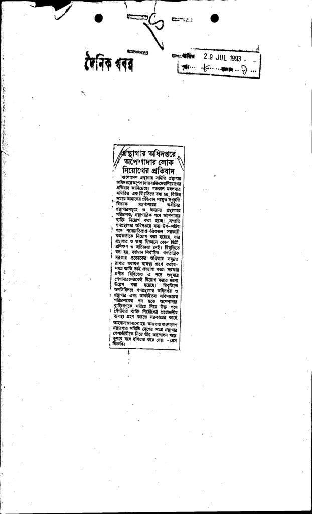 গ্রন্থাগার অধিদপ্তরের অপেশাদার লোক নিয়োগের প্রতিবাদ Published on Newspaper দৈনিক খবর Category General Education General Education Download