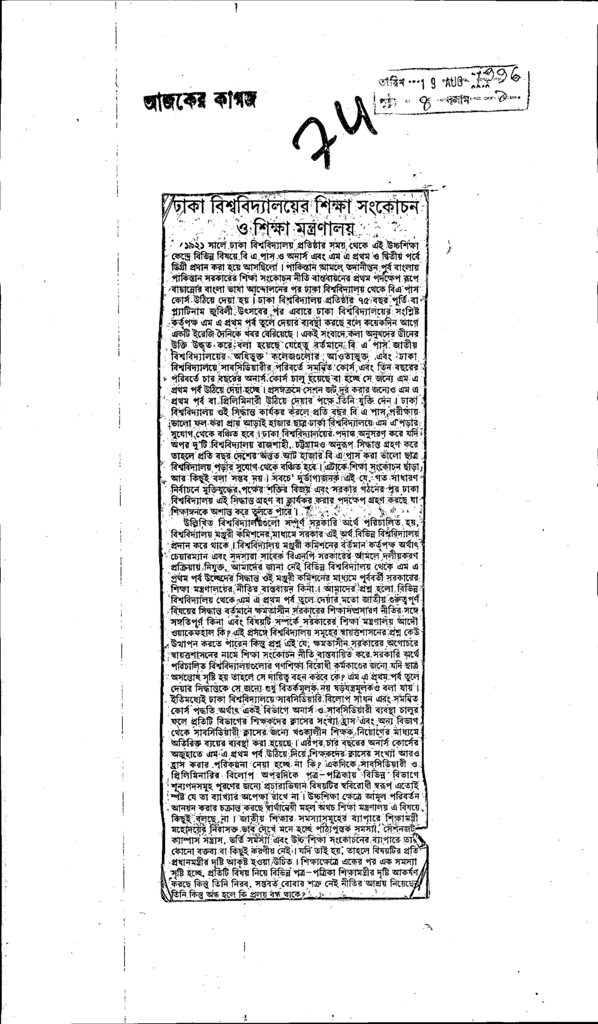 ঢাকা বিশ্ববিদ্যালয়ের শিক্ষা সংকোচন ও শিক্ষা মন্ত্রণালয়