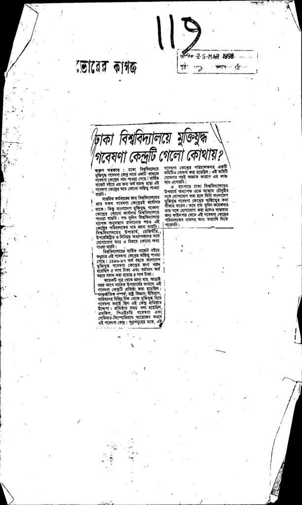 ঢাকা বিশ্ববিদ্যালয়ে মুক্তিযুদ্ধ গবেষণা কেন্দ্রটি গেলো কোথায়? Published on Newspaper দৈনিক ভোরের কাগজ Category General Education General Education Higher Education Public Download