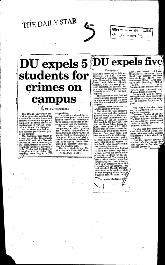 Du expels 5 students for crimes on campus Published on Newspaper The Daily Star Category General Education Higher Education Public Download