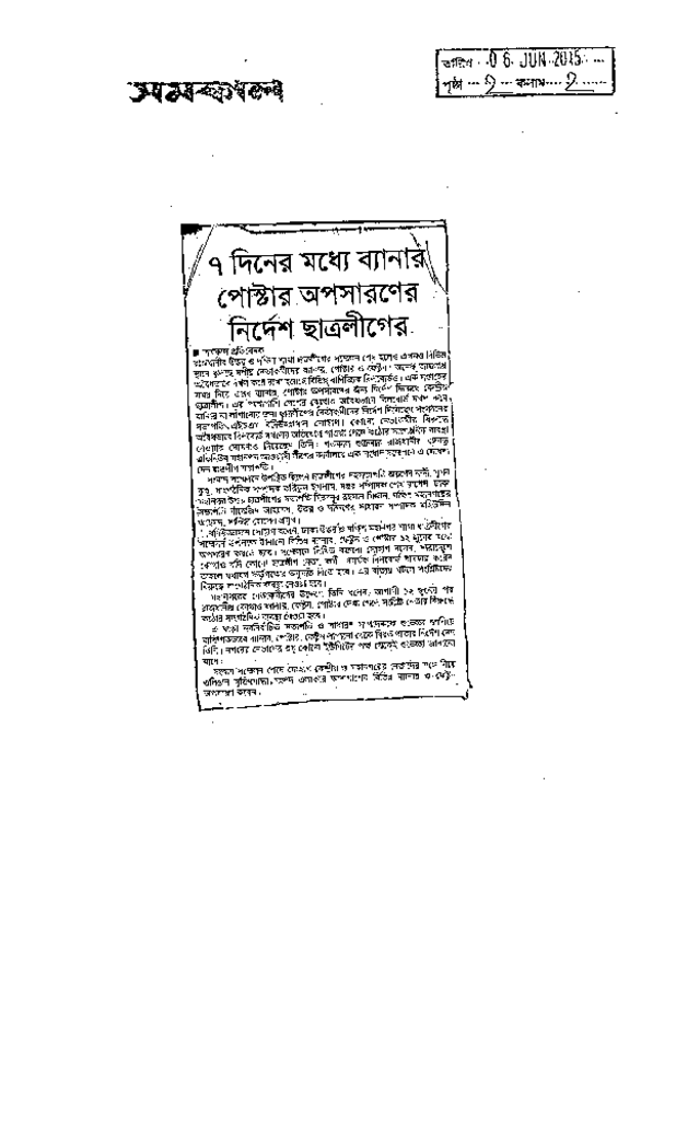 ৭ দিনের মধ্যে পোস্টার অপসারণের র্নিদেশ ছাত্রলীগের Published on Newspaper দৈনিক সমকাল Category Student Politics Download