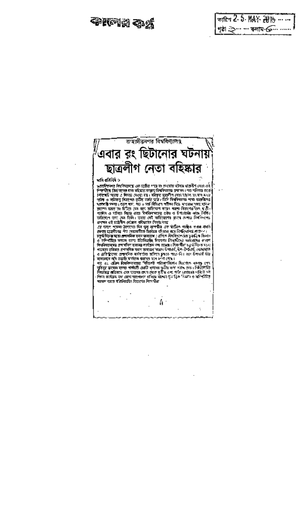 এবার রং ছিটানোর ঘটনায় ছাত্রলীগ নেতা বহিস্কার Published on Newspaper দৈনিক কালের কন্ঠ Category Student Politics Download