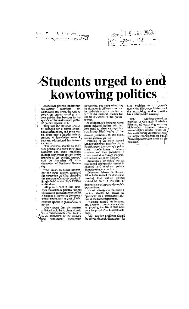 Students urged to end kowtowing politics Published on Newspaper The Bangladesh Observer Category Student Politics Download