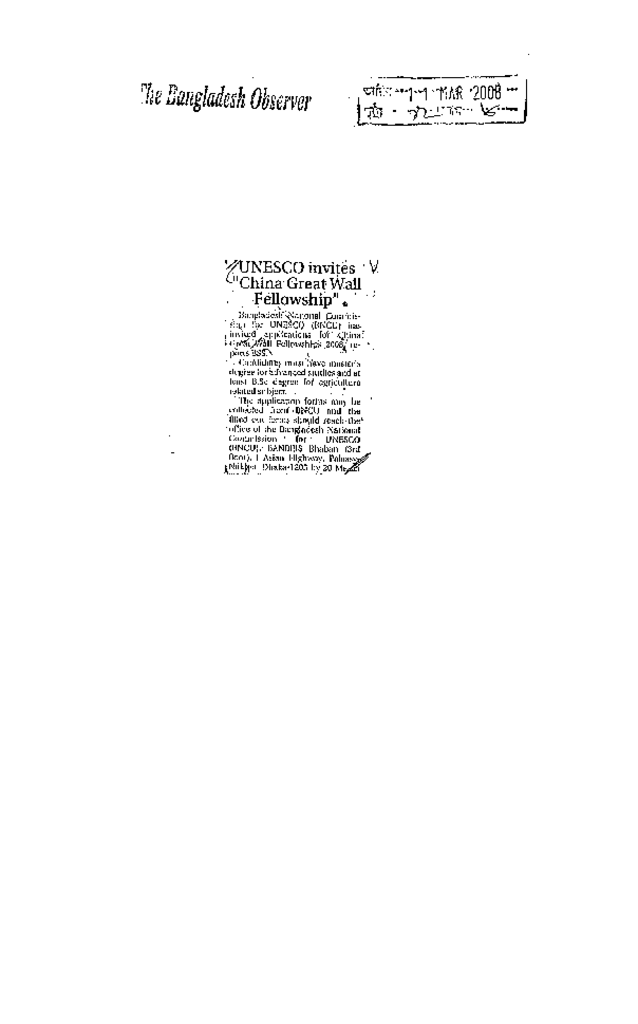 UNESCO invites China Great Wall Fellowship Published on Newspaper The Bangladesh Observer Category International Organization International Organization UNESCO Download