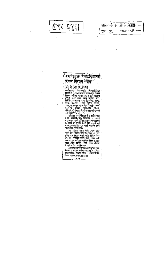 এমপিওভূক্ত শিক্ষাপ্রতিষ্ঠানের শিক্ষক নিবন্ধন পরীক্ষা ১৭ ও ১৮ অক্টোবর Published on Newspaper দৈনিক প্রথম আলো Category Others Download