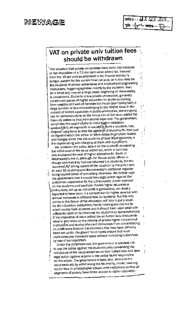 VAT on private univ tuition fees should be withdrawn Published on Newspaper New Age Category General Education General Education Higher Education Private Download