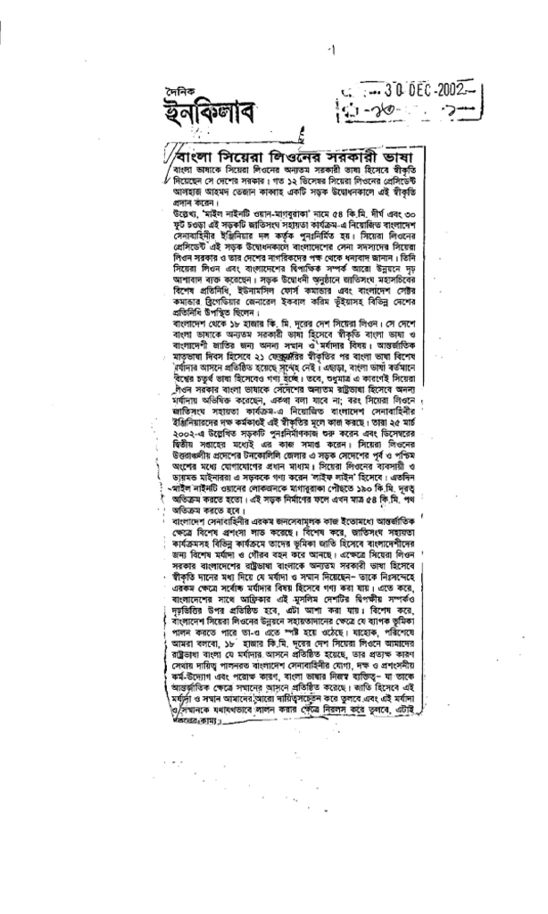 বাংলা সিয়েরা লিওনের সরকারি ভাষা