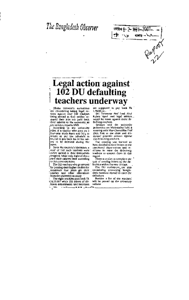 Legal Action Against 102 DU Published on Newspaper The Bangladesh Observer Category General Education General Education Higher Education Public Download