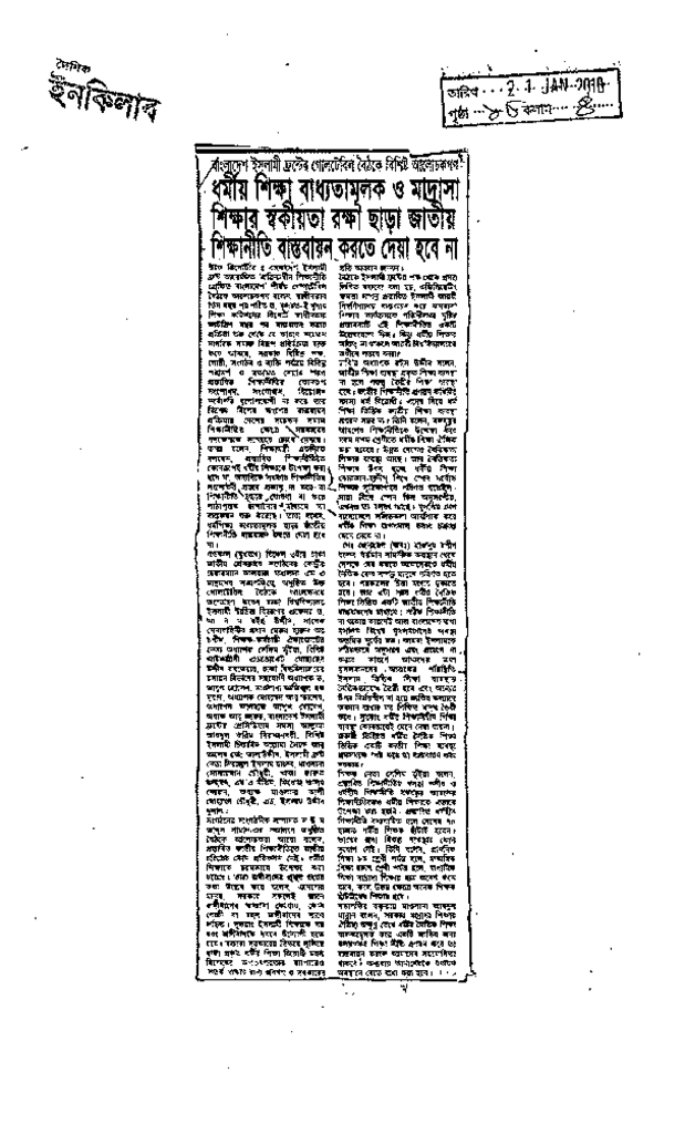 ধর্মীয় শিক্ষা বাধ্যতামূলক ও মাদ্রাসা শিক্ষার স্বকীয়তা রক্ষা ছাড়া জাতীয় শিক্ষানীতি বাস্তবায়ন করেত দেয়া হবে না Published on Newspaper দৈনিক ইনকিলাব Category General Education General Education Download