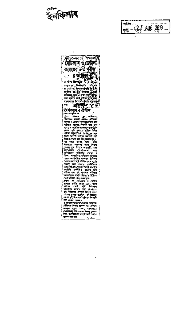২০১৩-২০১৪ শিক্ষাবর্ষ মেডিক্যাল ও ডেন্টাল কলেজের ভর্তি পরীক্ষা ৪ অক্টোবর Published on Newspaper দৈনিক ইনকিলাব Category Professional Education Admission/Seat Problem Professional Education Medical Download