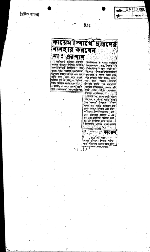 কায়েমীস্বার্থে ছাত্রদের ব্যবহার করবেন নাঃ এরশাদ