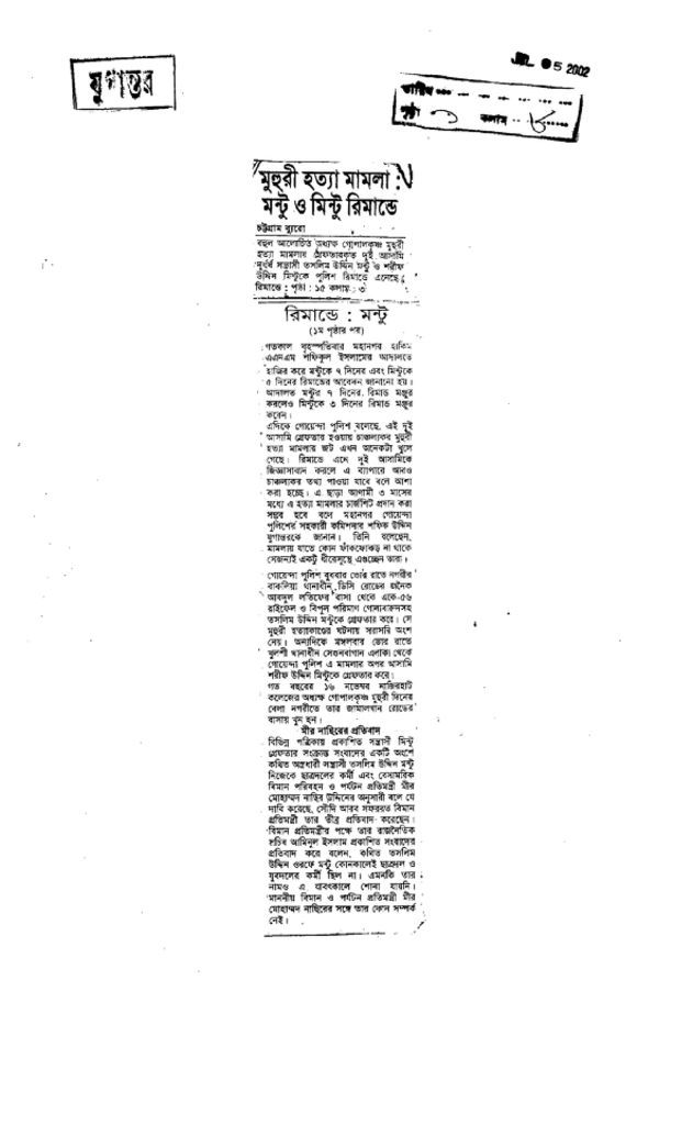 মুহুরি হ্ত্যাকান্ড : মন্টু ও মিন্টু রিমান্ডে Published on Newspaper দৈনিক যুগান্তর Category Others Download
