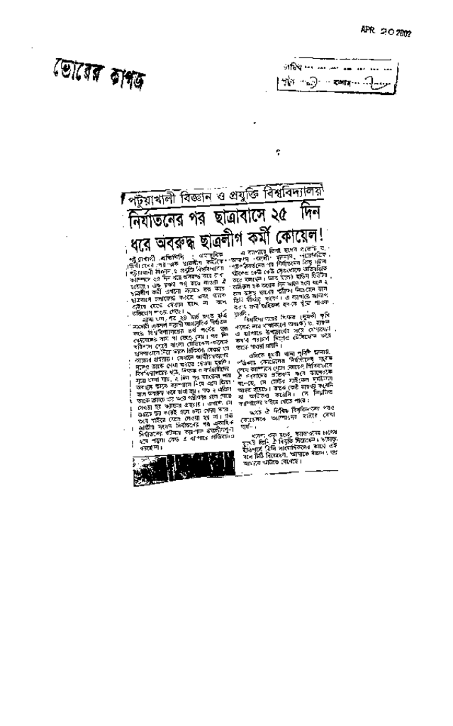নির্যাতনের পর ছাত্রাবাসে ২৫দিন ধরে অবরুদ্ধ ছাত্রলীগ কর্মী কোয়েল ! Published on Newspaper দৈনিক ভোরের কাগজ Category Campus Terrorism Download