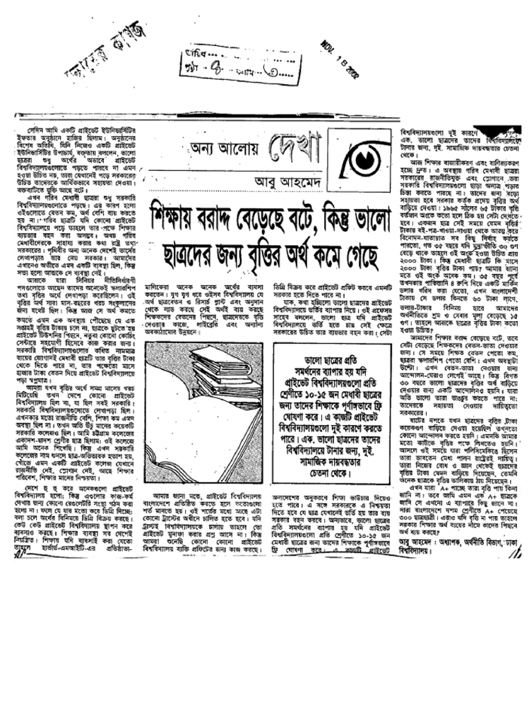 শিক্ষায় বরাদ্দ বেড়েছে বটে, কিন্তু ভালো ছাত্রদের জন্য বৃত্তির অর্থ কমে গেছে Published on Newspaper দৈনিক ভোরের কাগজ Category Personal Opinion / Discussion / Commentary Download