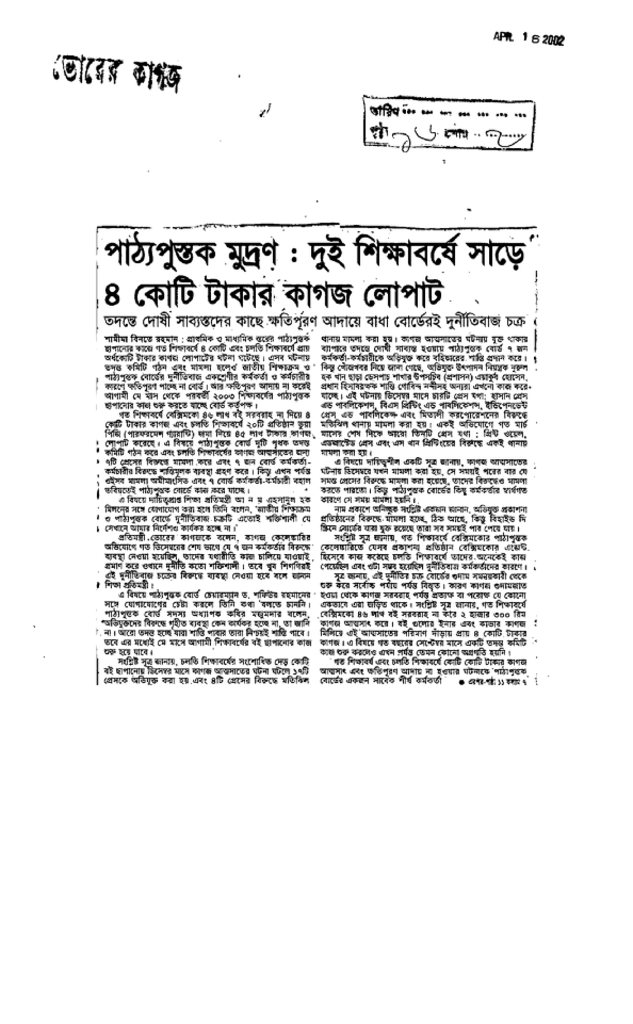 পাঠ্যপুস্তক মুদ্রণ : দুই শিক্ষাবর্ষে সাড়ে ৪ কোটি টাকার কাগজ লোপাট Published on Newspaper দৈনিক ভোরের কাগজ Category General Education Download