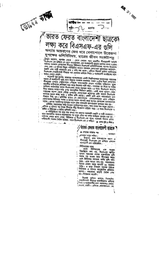 ভারত ফেরত বাংলাদেশী ছাত্রকে লক্ষ্য করে বিএসএস-এর গুলি Published on Newspaper দৈনিক ভোরের কাগজ Category Others Download