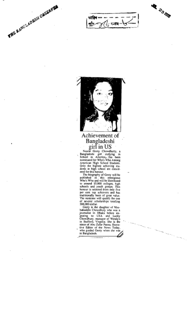 Achievement of Bangladeshi girl in US Published on Newspaper The Bangladesh Observer Category Others Download