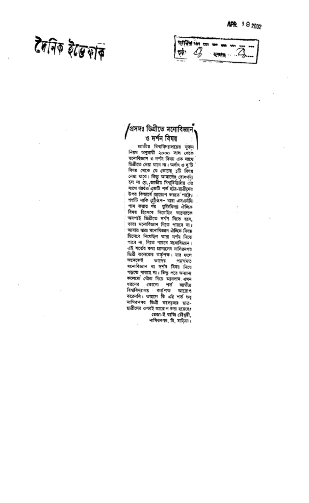 প্রসঙ্গঃ ডিগ্রীতে মনোবিজ্ঞান ও দর্শন বিষয় Published on Newspaper দৈনিক ইত্তেফাক Category Others Download