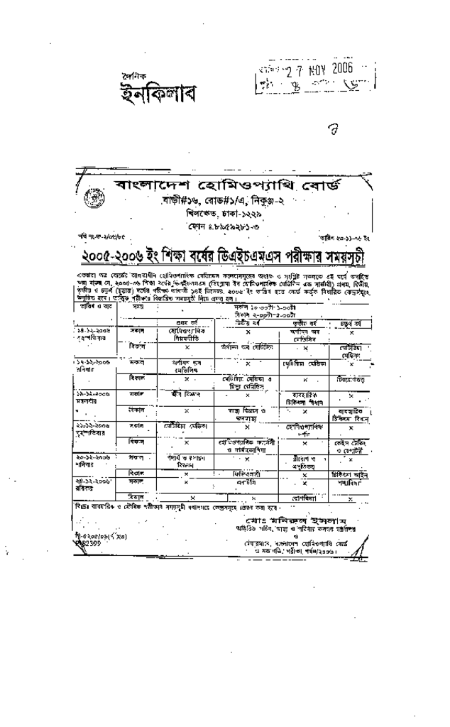 ২০০৫-২০০৬ ইং শিক্ষা বর্ষের ডিএইচএমএস পরীক্ষার সময়সূচী Published on Newspaper দৈনিক ইনকিলাব Category Others Download