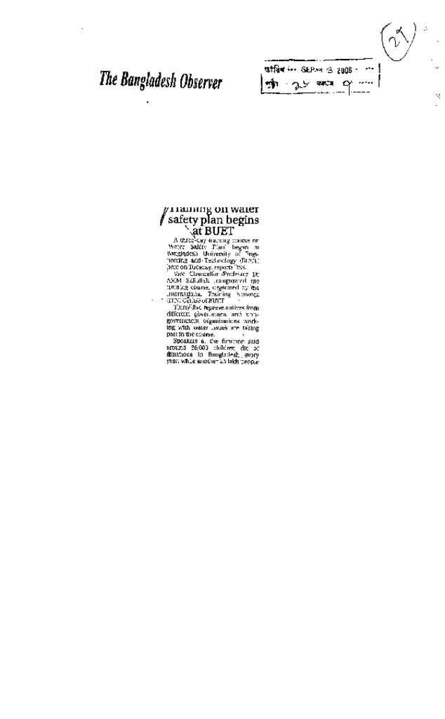 Training on water safety plan begins at BUET Published on Newspaper The Bangladesh Observer Category Others Download