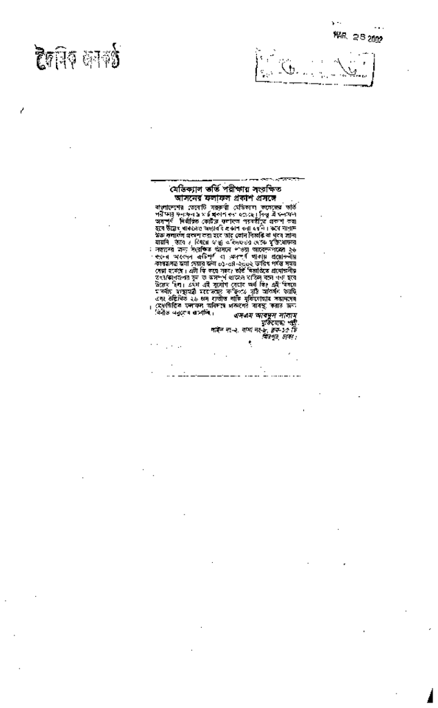 মেডিক্যাল ভর্তি পরীক্ষার সংরক্ষিত আসনের ফলাফল প্রকাশ প্রসঙ্গে Published on Newspaper দৈনিক জনকণ্ঠ Category Professional Education Professional Education Medical Download