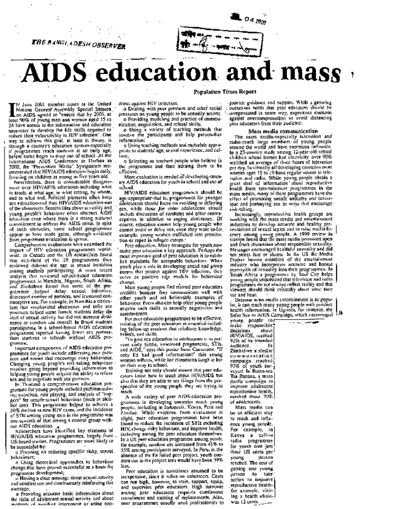 AIDS education and mass Published on Newspaper The Bangladesh Observer Category Professional Education Professional Education Medical Download