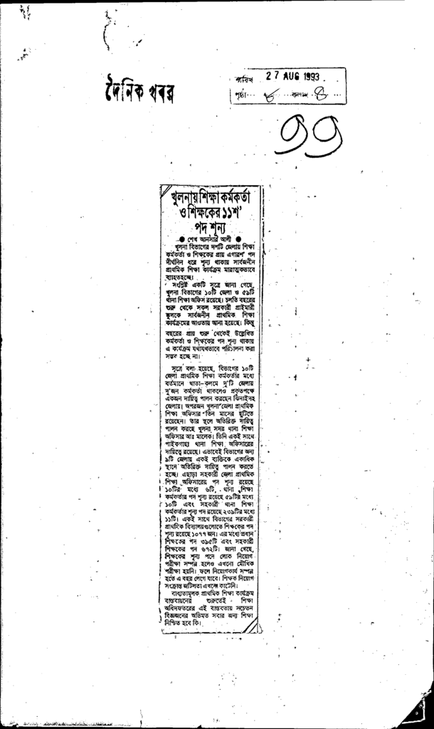 খুলনায় শিক্ষা কর্মকর্তা ও শিক্ষকদের ১১শ পদ শূন্য Published on Newspaper দৈনিক খবর Category General Education Download