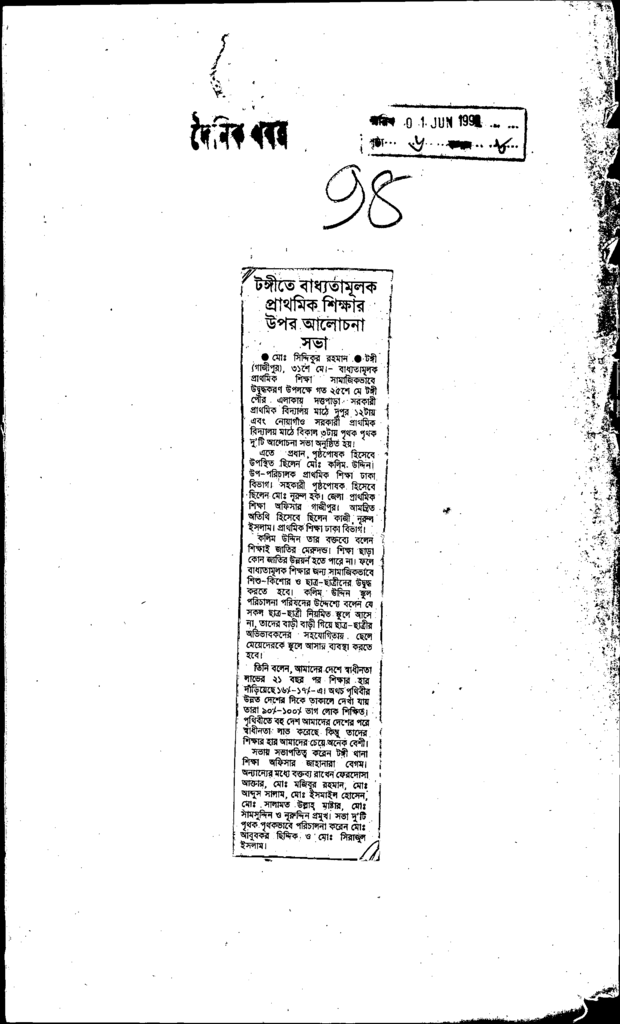 টঙ্গীতে বাধ্যতামূল প্রাথমিক শিক্ষার উপর আলোচনা সভা Published on Newspaper দৈনিক খবর Category General Education Download